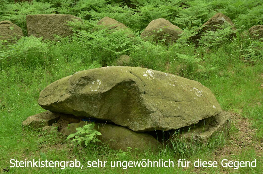 Wer den Vorgeschichtspfad erwandert hat, sollte nicht versäumen, das Steinkistengrab ein Stück außerhalb des Waldes zu besuchen.